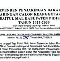 Pidie - Tim Independen Penjaringan Bakal Calon dan Penyaringan Calon Keanggotaan Baitul Mal Kabupaten (BMK) Pidie Tahun 2025-2030, mengumumkan 15 nama-nama yang dinyatakan lulus seleksi wawancara, Rabu (31/12/2025).